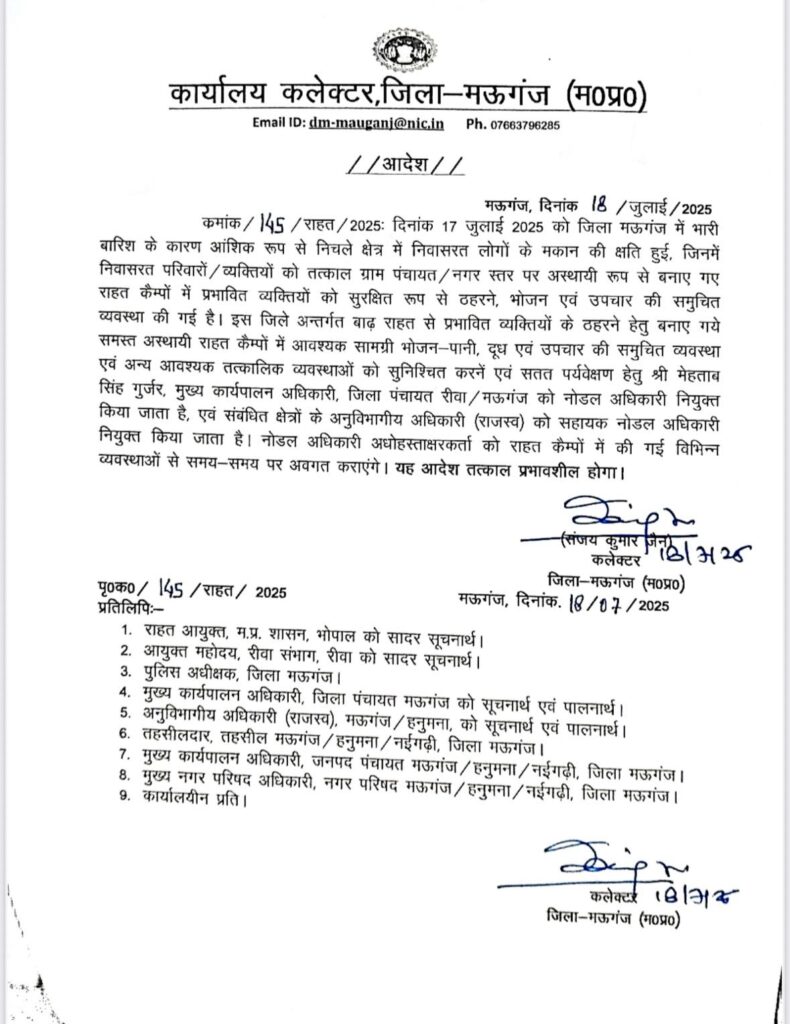 मऊगंज, मध्यप्रदेश | लगातार हो रही तेज बारिश ने मऊगंज जिले में जनजीवन अस्त-व्यस्त कर दिया है। शहरी इलाकों से लेकर ग्रामीण बस्तियों तक भारी जल भराव की स्थिति बनी हुई है, जिससे कई कच्चे मकान ढह गए हैं। पानी की मार से बेघर हुए परिवारों को अब सरकारी राहत शिविरों में शरण लेनी पड़ रही है। प्रशासन ने स्थिति को गंभीर मानते हुए शहरी और ग्रामीण क्षेत्रों में स्थित स्कूल भवनों व अन्य सामुदायिक परिसरों को अस्थायी राहत शिविरों में तब्दील कर दिया है। यहां बाढ़ प्रभावित लोगों को अस्थाई रूप से ठहरने की सुविधा दी जा रही है, ताकि वे सुरक्षित स्थानों पर रह सकें।जिला प्रशासन की ओर से राहत कार्यों की निगरानी के लिए जिला पंचायत के मुख्य कार्यपालन अधिकारी मेहताब सिंह गुर्जर को नोडल अधिकारी नियुक्त किया गया है। कलेक्टर मऊगंज संजय कुमार जैन ने श्री गुर्जर को निर्देशित किया है कि राहत शिविरों में भोजन, स्वच्छ पेयजल, बच्चों के लिए दूध, बीमारों के लिए प्राथमिक उपचार और अन्य जरूरी व्यवस्थाएं तत्परता से उपलब्ध कराई जाएं।